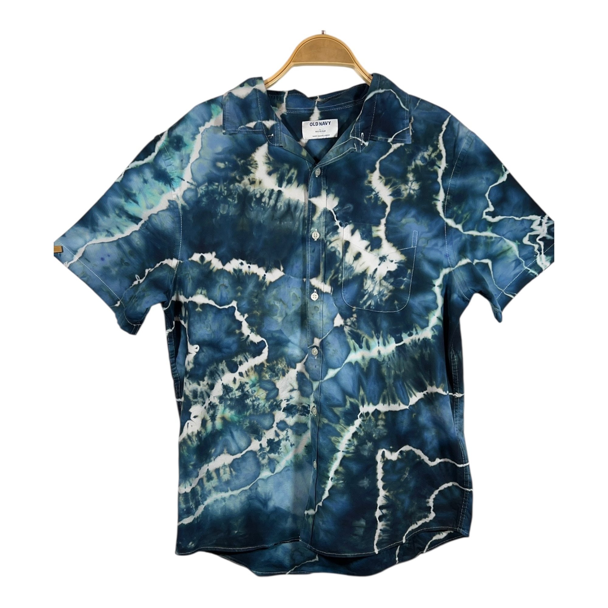 Size: Large men’s Cotton blend button down short sleeve shirt. Hand tied and ice dyed garment. All pictures are taken with no filters and no touchups of pictures.