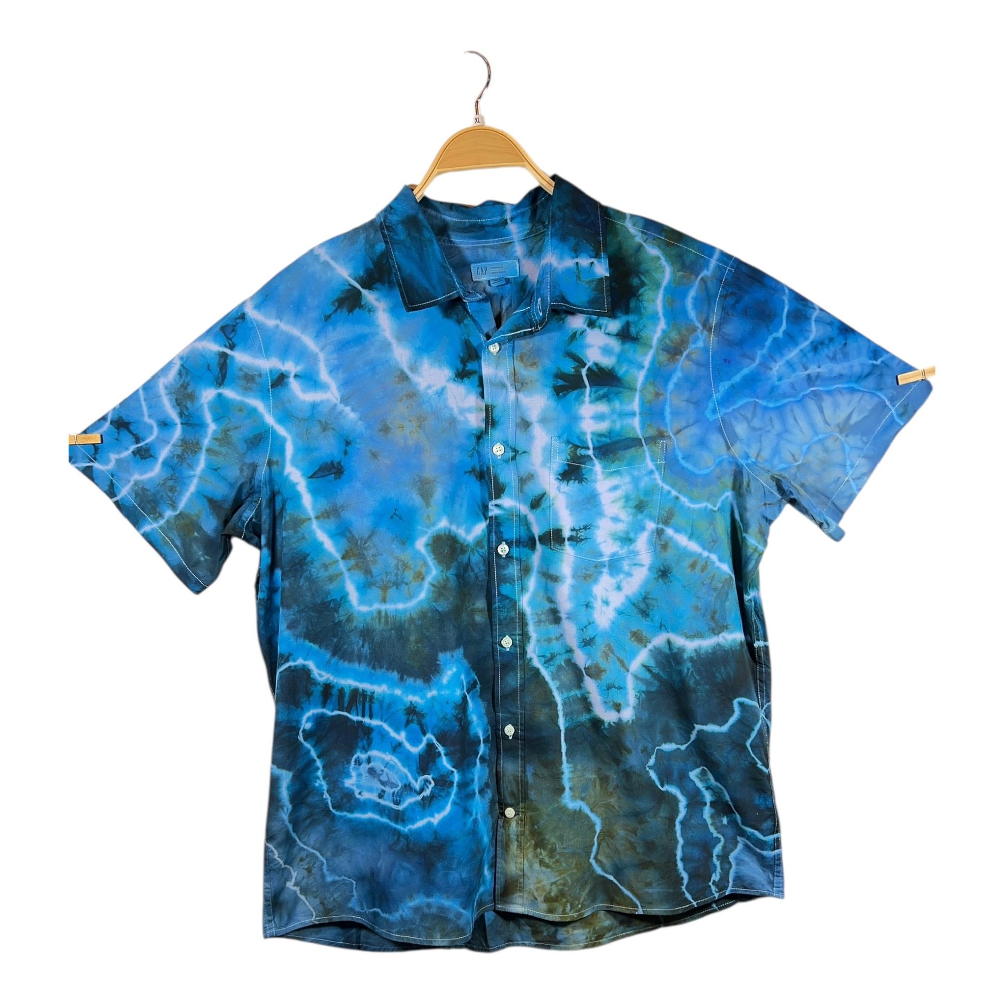 Size: XLarge men’s light poplin button down short sleeve shirt. Hand tied and ice dyed garment. All pictures are taken with no filters and no touchups of pictures.