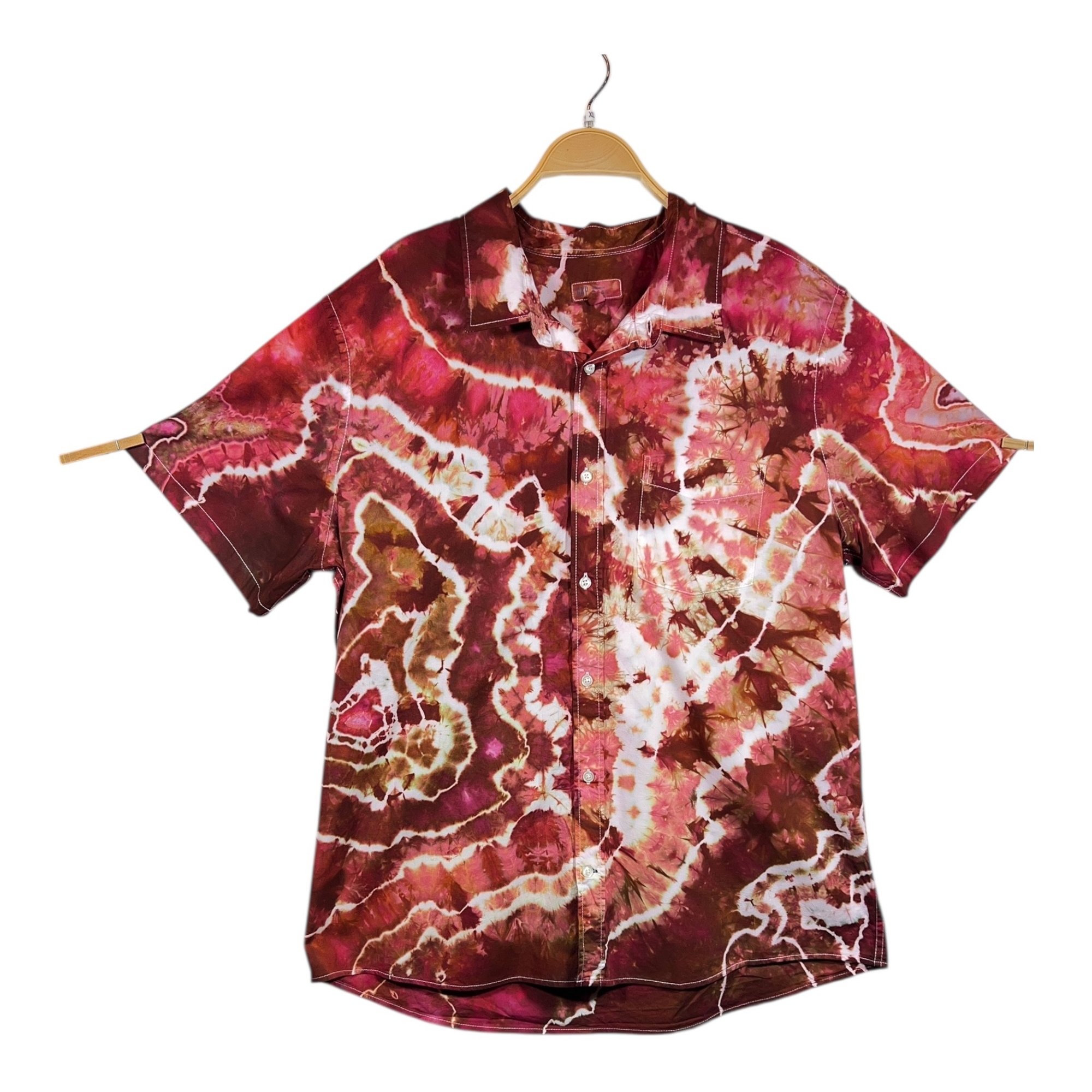 Size: XLarge men’s light poplin button down short sleeve shirt. Hand tied and ice dyed garment. All pictures are taken with no filters and no touchups of pictures.